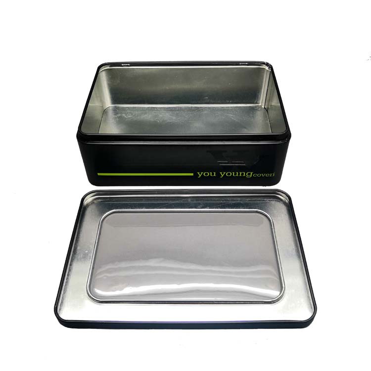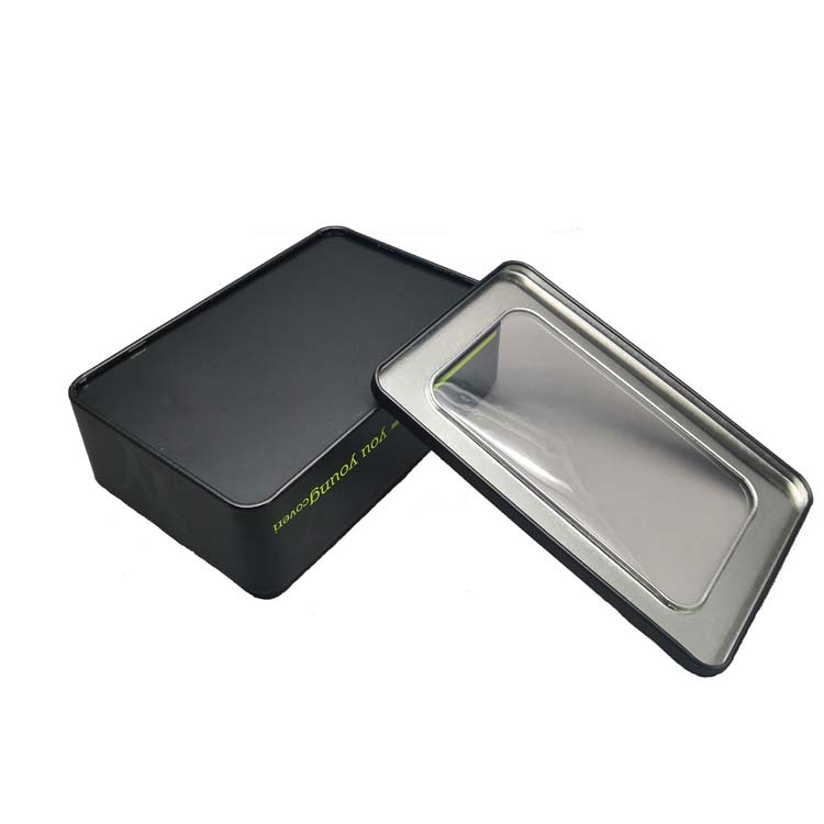Rectangle tin box with big clear PVc window on top, is made for electronic data cable packaging, or any products that need to be observed before unpacking.